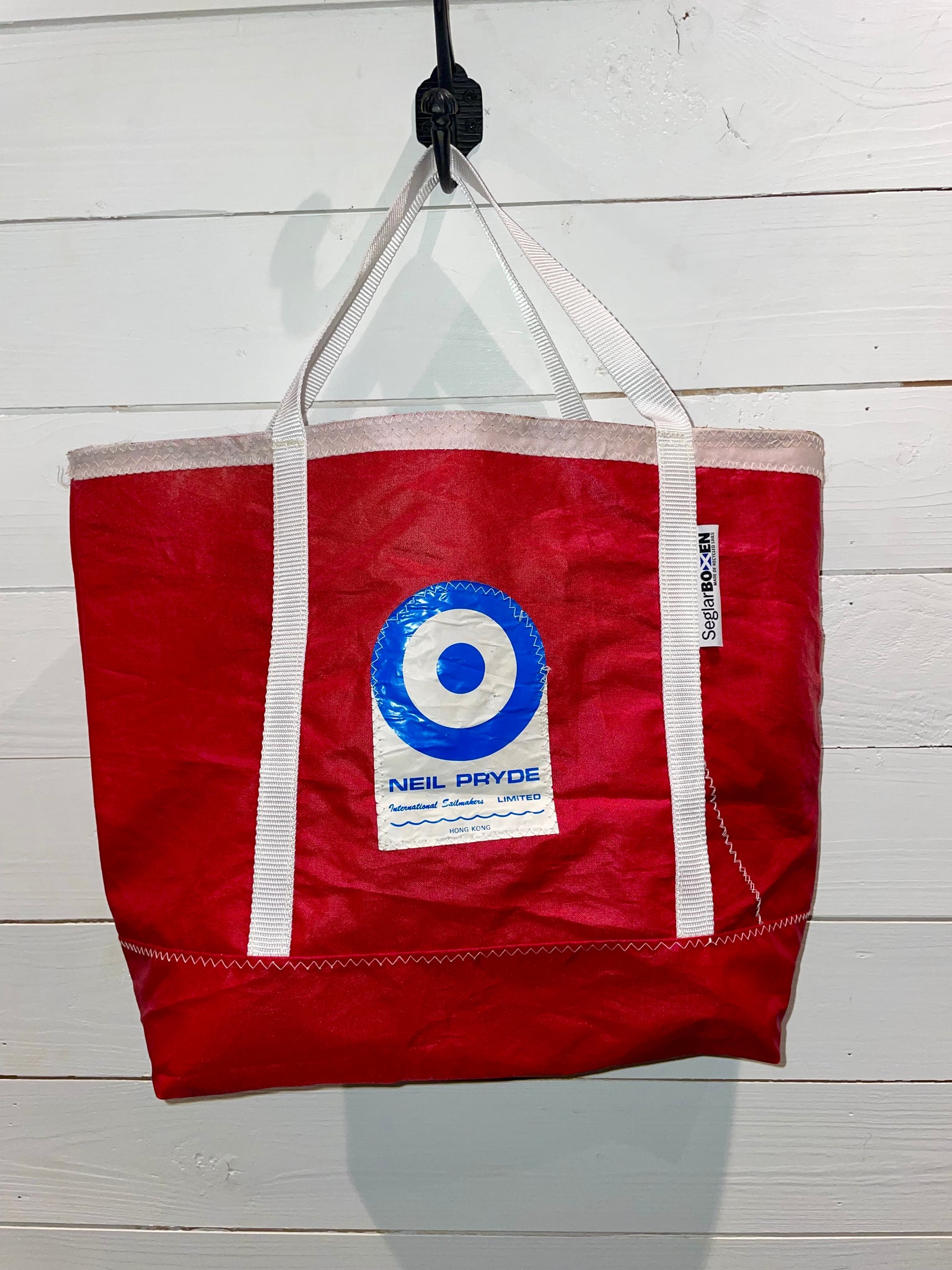 Fodrad väska sydd av ett rött Optimistsegel med segelmakarens logotype som läcker detalj.
