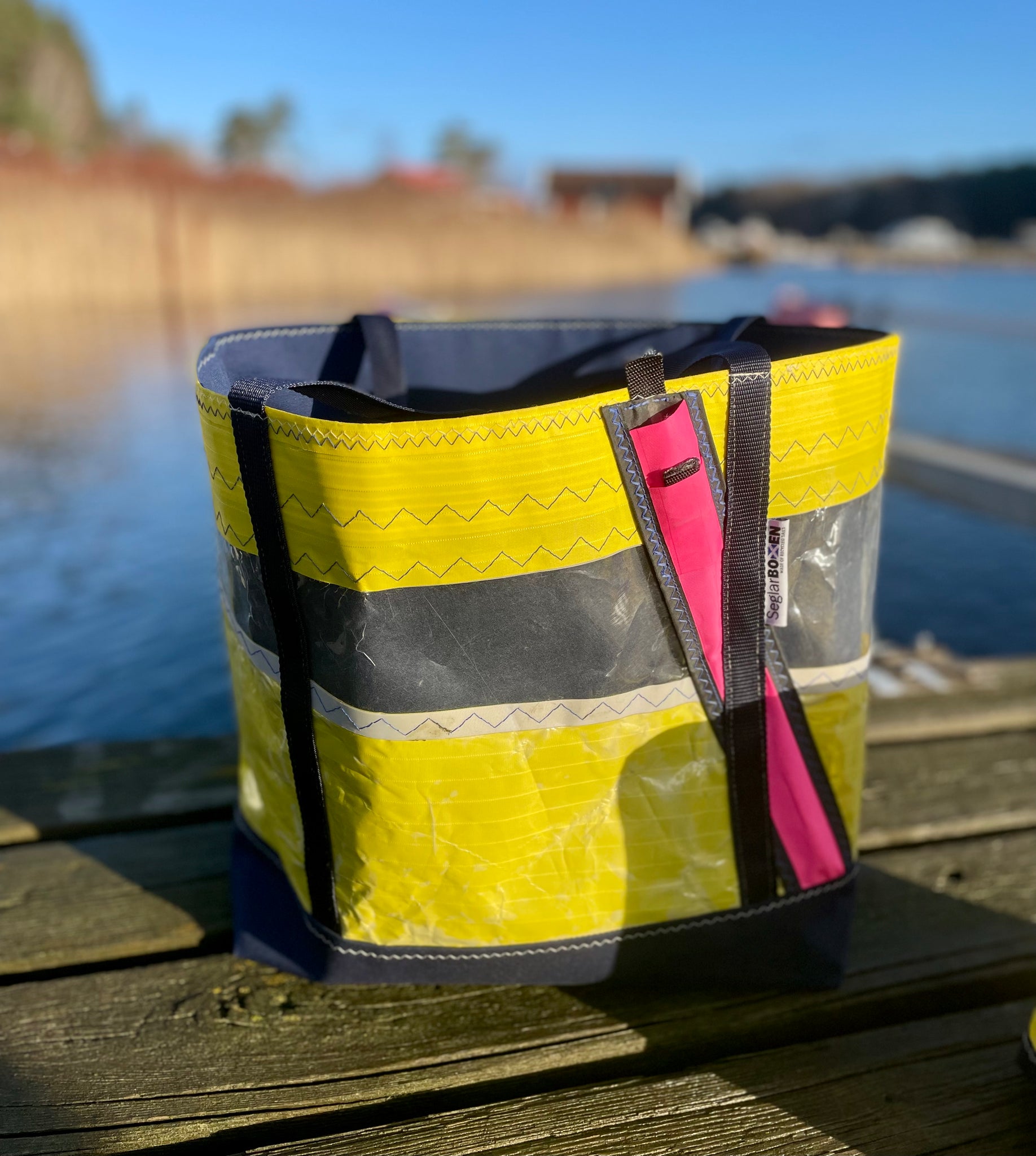 En väska för den som älskar vågor och vind! Sydd av ett läckert surfsegel med sikruta och en lattaficka som läckra detaljer. Fodrad med blå kapellvävsstuv